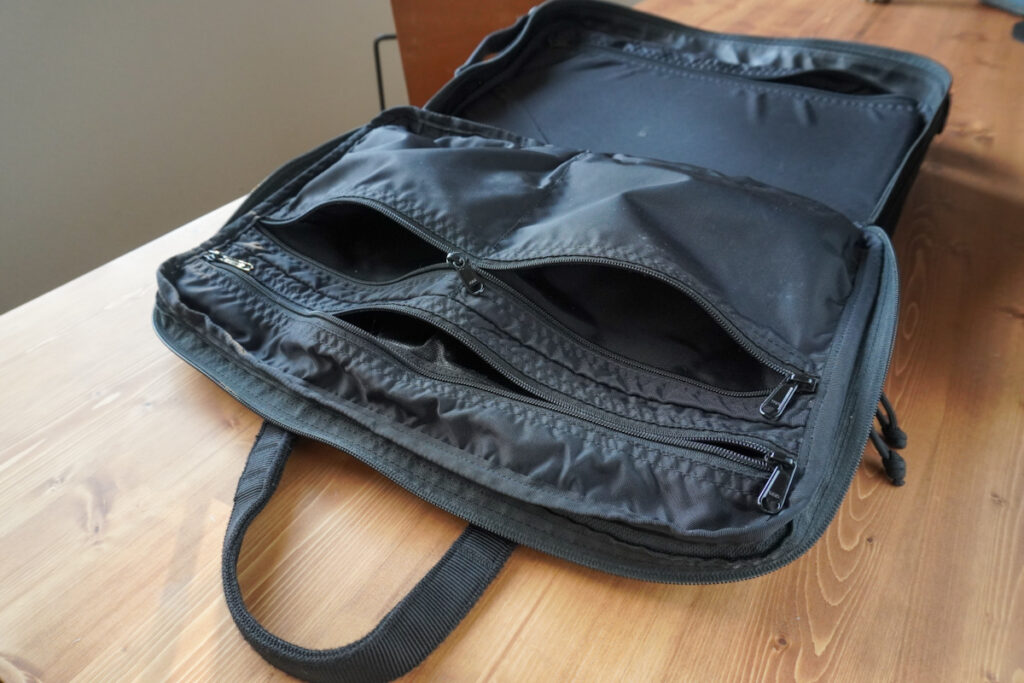 使っていて満足しているのは、フロントポケットもメインの収納部も大きく開く出し入れのしやすさと、ブリーフィングのアイテムで、かつビジネスシーンにも馴染むオールブラックのデザイン性かなと感じています。